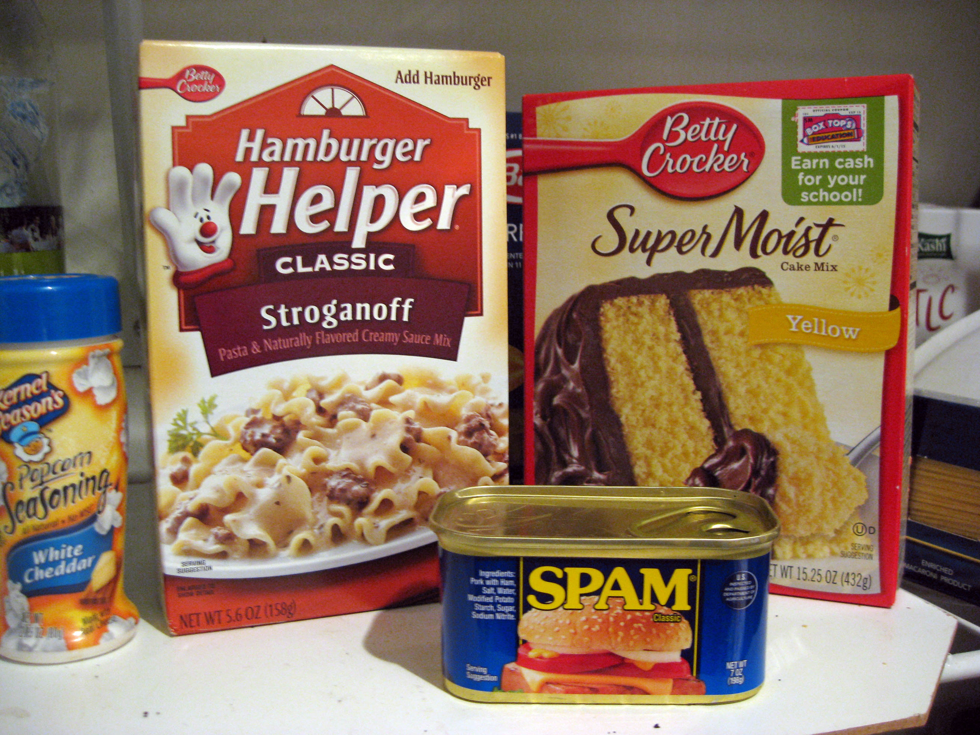 Hamburger Helper, instant cake mix, Spam: 79 ingredients and counting.